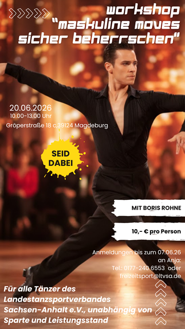 in diesem Jahr ist es wieder soweit! Im Rahmen von Workshops bietet der Landestanzsportverband Sachsen-Anhalt e.V. all seinen Mitgliedern zusätzliche Tanzangebote an. Diese Angebote sind spartenübergreifend und können von Karnevalisten, LineDancern, Modern Dancern, Standard-/ Lateintänzern, Discofoxern, Solisten oder andere Tänzern in Anspruch genommen werden.
